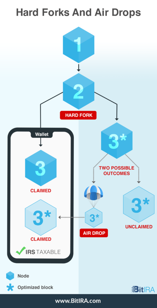 As the blockchain undergoes a hard fork, users are left with a coin from the original protocol (3). They can choose to claim the new protocol’s coin (3*), or it might be sent to their wallet via airdrop with no action taken by the user. According to the IRS, once the coin is in the user’s wallet, it is taxable—even if they did not explicitly act to place it there.